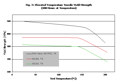Micro & Nano-2 MMC systems have been developed particularly for high temperature applications. They have higher strength at elevated temperatures, lower Coefficients of Thermal Expansion ("CTE"), higher fatigue resistance and higher wear resistance than those of conventional high temperature aluminum alloys. Fatigue resistance is a particularly differentiating property providing improvement of two orders of magnitude in high cycle fatigue conditions comparing with 2000 series aluminum alloys. Micro-2 & Nano-2 MMCs can be extruded, forged, rolled, machined and heat treated in a manner similar to the base aluminum alloy. Figure 2 compares Nano-2S/MMC with 2618-Al and 4032-Al between room temperature and 200<C.